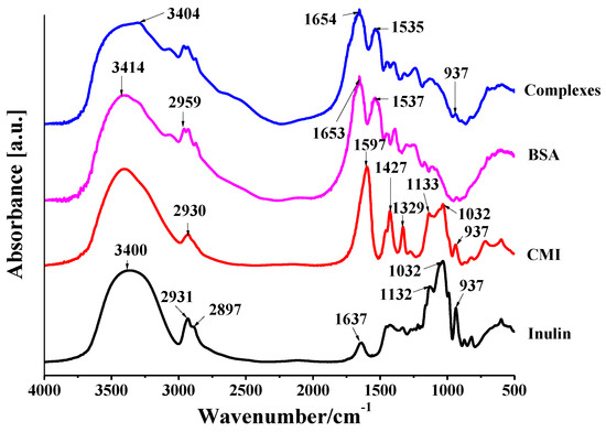 Infrared spectra of inulin, carboxyl methyl inulin (CMI), bovine serum albumin (BSA), and CMI/BSA complexes.