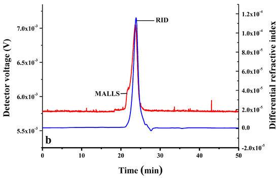 The molecular weight of CMI was determined while using gel permeation chromatography multi-angle laser light scattering (GPC-MALLS-RID). GPC chromatograms of CMI with a sharp peak are shown in Figure 4a. The value of dn/dc (mL/g) and polydispersity (Mw/Mn) of CMI were 0.13 and 1.11, respectively, which indicated that CMI was monodisperse [45,46]. When compared with GPC chromatograms of inulin in Figure 4b, the peak of CMI had shorter retention time, which suggested that the molecular of CMI was higher than inulin (2.70 × 103 ± 96 Da). This increment was attributed to the success of grafting of carboxy methyl groups in the inulin backbones [47,48]. The molecular weight of CMI was calculated as 3.93 × 103 ± 31 Da. Additionally, DS of CMI was determined to be 0.49 ± 0.0022 while using titration methods.