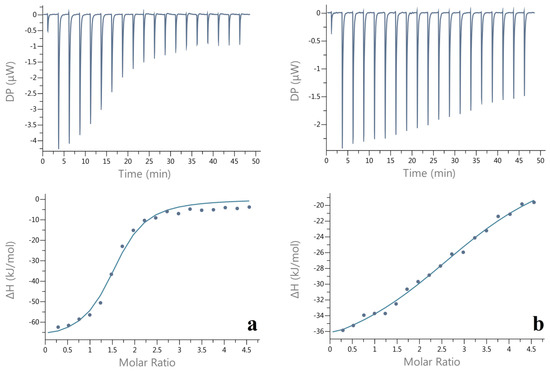 The thermodynamic injections of CMI solution into BSA solution were set at 2 μL every 150 s under pH 4.0 and pH 2.60, respectively, with CNaCl of 10 mM. As the thermodynamic graph shown in Figure 7, a sequence of strong successive exothermic peaks of decreasing intensity was initially observed. With more injections, the released binding energy continuously declined and then reached to a state of thermodynamic stability after the 12nd and 14th injection, respectively. Similar results were observed in lactalbumin/chitosan complexes, gelatin/sodium carboxymethyl cellulose complexex, and ovalbumin/carboxymethylcellulose complexes [28,60,61].