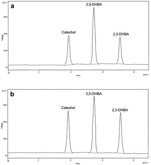 The salicylate hydroxylation assay with production of catechol, 2,5-DHBA, and 2,3-DHBA was monitored by HPLC-ED (coulometric detector) to assess •OH generation. In Figure 2, chromatograms of salicylic acid hydroxylation products after the standardized Fenton’s reaction in the presence of Fe(III) (a) and Cu(I) (b) are shown.