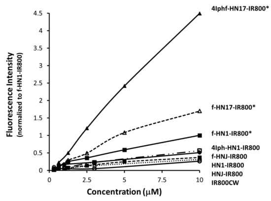 Figure 2. Relative uptake of peptides as IR800 conjugates, as a function of incubation concentration in cultured Cal 27 cells measured by fluorescence of the washed, lysed cells after 2 h of incubation. Cal 27 cells were incubated with the agents at 0.625–10 μM. Cell uptake is normalized to f-HN1-IR800 at 10 μM (1.0 on the vertical scale). The bottom most curve is the unconjugated IR800 dye as the carboxylate. * indicates statistical difference from HN1-IR800 at p < 0.05. Tables S2 and S3 detail methodology and report numerical data points in the figure, with uncertainties and p values.