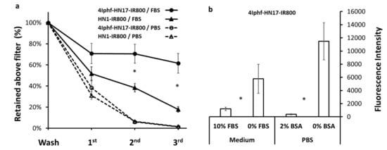 Figure 4. (a) Comparison of binding of 4Iphf-HN1-IR800 and HN1-IR800 to proteins in FBS (fetal bovine serum). The horizontal axis refers to the number of washings of the filtered fraction. Bound agents were retained above the 10 kDa molecular size filter. * 4Iphf-HN17-IR800 was retained to a significantly greater degree (p < 0.05) than HN1-IR800. (b) 4Iphf-HN17-IR800 was incubated for 1 h with Cal27 cells with and without an albumin source. Demonstration that FBS or BSA (bovine serum albumin) presence in the incubation media during incubations with Cal 27 cells diminishes the cell uptake, eliminating albumin uptake as a mechanism for peptide uptake. * p < 0.05.