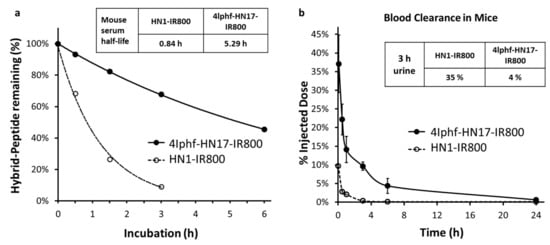 Serum stability was investigated as an important factor for an agent to maintain its effective concentration in vivo. As shown in Figure 5a 4Iphf-HN17-IR800 had a serum half-life 6.3-fold longer than HN1-IR800 in mouse serum at 37 °C (5.29 h vs. 0.84 h). In aqueous buffer, the peptides were stable (unchanged in HPLC) for 2 days, and also for 2 weeks frozen at −20 °C.