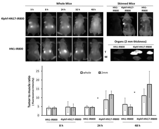 4Iphf-HN17-IR800 was further investigated in mice bearing Cal 27 flank xenograft tumors. Results are shown in Figure 6 with further organ images in Figure S7. We used an intravenous dose of 40 nmol per mouse (~2 μmol/kg), which appeared on a pilot study to quickly distribute throughout the tissue space. The 40 nmol dose was chosen to produce at least a 10 μM concentration when distributed into ~4 mL of extracellular space to match the 10 μM concentration used in the screening experiments. The mice were imaged at 3–48 h post administration. The IR800 dye used is known to be associated with high tissue background at earlier times [13,24,25,26], and its mass is up to 40% of the total mass of conjugates. Counter balancing this, uptake in tumors was also slow to wash out. As shown in Figure 6, tumors gradually stood out more prominently as the background fluorescent signal diminished. This was also found for UM-SCC-1 tumor mice (data not shown) and orthotopically implanted medullary thyroid tumor mice treated with 4Iphf-HN17-IR800 [27]. In contrast, tumors in mice administered 40 nmol of HN1-IR800 exhibited a similar fluorescence intensity in the tumor and in the rest of the body during the whole observation period, even at high exposure rates in the imager. Tumors with 4Iphf-HN17-IR800, but not HN1-IR800, were more conspicuous after the mouse was skinned. To better compare and semi-quantitate the fluorescence intensity, excised tumors were imaged adjacent to similarly sized masses of excised skeletal muscle. The tumor and muscle masses were then sliced into 2 mm thickness samples to minimize differential attenuation of the emitted light, as described previously [28]. Figure 6 shows that the images of tumors from 4Iphf-HN17-IR800 administered mice had greater tumor to muscle signal ratios for both whole tumor and 2 mm thickness sections at 48 h post administration, with a nearly four-fold difference between the fluorescence emission of the 2 mm thickness tumor versus muscle (n = 4, p < 0.05).