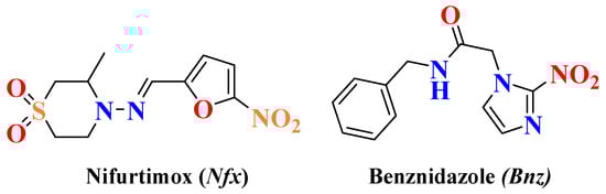 Regarding treatment, there are only two nitrated chemotherapeutic agents: nifurtimox (Nfx) ((R,S)-3-methyl-N-[(1E)-(5-nitro-2-furyl)methylene]thiomorpholin-4-amine-1,1-dioxide) and benznidazole (Bnz) (N-benzyl-2-(2-nitro-1H-imidazol-1-yl)acetamide) (Figure 1), which are usually more effective in the acute stage. However, therapy with both drugs shows serious side effects, as well as the development of resistance to parasites [].
