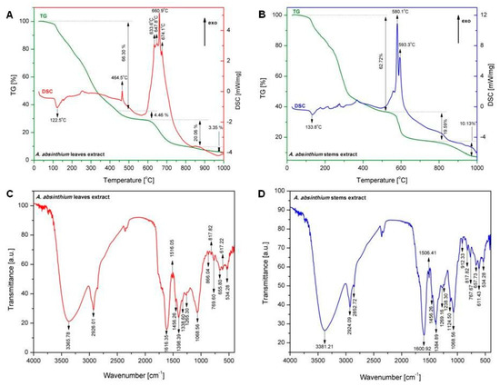 A—TG-DSC curves of A. absinthium leaves extract, B—TG-DSC curves of A. absinthium stems extract, C—FT-IR spectra of A. absinthium leaves extract, D—FT-IR spectra of A. absinthium stems extract.