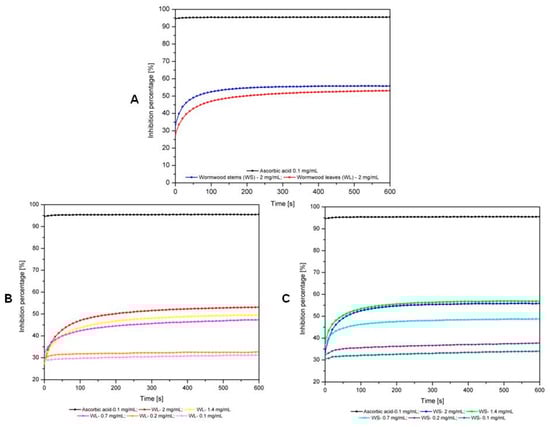 The time dependent inhibition percentage of A. absinthium extracts: A—A. absinthium stock solutions based on leaves and stems vs. ascorbic acid; B—extracts of A. absinthium leaves vs. ascorbic acid; C—extracts of A. absinthium stems vs. ascorbic acid.