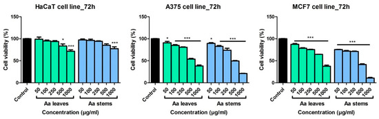 In vitro cytotoxicity assessment of A. absinthium leaves and stems ethanolic extracts (50, 100, 250, 500 and 1000 µg/mL) on a non-tumor cell line–HaCaT–human keratinocytes and on two human tumor cell lines A375—melanoma cells and MCF7–breast adenocarcinoma cells at 72 h post-stimulation by the means of Alamar blue assay. The results are expressed as cell viability percentage (%) related to Control (cells stimulated with ultrapure water). The data represent the mean values ± SD of three independent experiments. Comparison among the groups was performed using the One-way ANOVA test followed by Dunnett’s post-test. (* p < 0.05; *** p < 0.001).