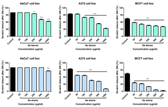 In Figure 4, the effect of A. absinthium leaves and stems extracts on HaCaT, A375 and MCF7 cells is shown. Regarding the effect of A. absinthium leaves on HaCaT cells, at low concentrations (50 and 100 µg/mL) stimulation with the extract induced a pro-migratory effect upon the non-tumor cells, the results being similar to those obtained in the Control group. For these concentrations the scratch closure rate after 24 h was 100%. At the concentration of 250 µg/mL, the leaves extract elicited a mild anti-migratory effect, showing a scratch closure rate of 95.4%. On HaCaT cells, at the higher doses tested, A. absinthium leaves extract slowed down the migratory effect, showing a scratch closure of 70.8% (500 µg/mL) and 62.7% (1000 µg/mL), respectively. Stimulation with the stems extract elicited a significant pro-migratory effect on the HaCaT cells with scratch closure rate of 100% for concentration ranging from 50 to 500 µg/mL. Only at the highest dose tested, an anti-migratory effect was noticed, having a scratch closure percentage of 85.5%. The data obtained indicate that the stems extract exhibited a superior pro-migratory effect on the non-tumor cells. Furthermore, no changes in the shape and morphology of HaCaT cells were noticed following stimulation with the samples (see Supplementary Figure S2).