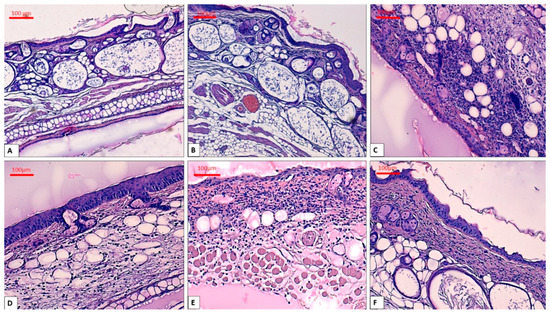 Skin specimens from the control group had normal histological structures, while the group treated with acetone showed marked edema and congestion of the blood vessels but without inflammation or changes of the epidermal thickness (Figure 5A,B).