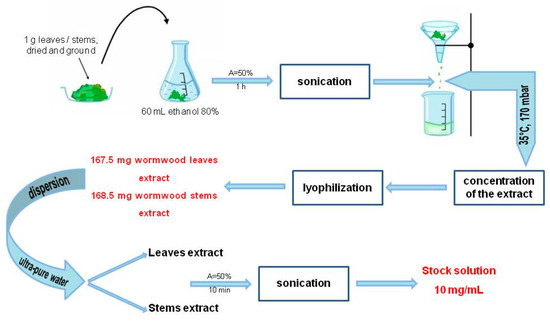 Ethanolic extracts from A. absinthium leaves and stems were obtained according to the method of Mau et al., slightly modified [42]. Procedures were as follows: 1 g of dried and ground sample (leaves/stem) was mixed with 60 mL ethanol 80% and sonicated for 1 h at room temperature (amplitude A = 50% and cycle C = 0.5) with an UP200S Ultrasonic Homogenizer from Hielscher (Wanaque, NJ, USA).