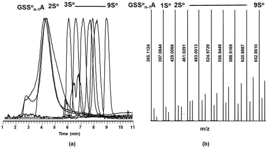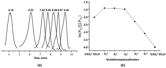 The initial glutathione-based products observed by LC-HRMS were the oxidized polysulfanes, GSSnSG (n = 0 to 8), which have been previously shown to be produced in these reactions []. Figure 1 shows a typical LC trace (Figure 1a) with individual SIC peaks (Figure 1b) obtained by refining a total ion mass spectrum to a unique m/z value attributable to each GSSnSG species (Figure 1c). The elution profiles of these species occurred within the first 10 min of separation, both the separation and sequential LC spacing of the individual SIC peaks confirm that each species was present in the original reaction mixture. Notably better LC separation was obtained using formic acid/methanol and formic acid/acetonitrile (Supplementary Materials S1) as carrier streams, and both separation methods identified multiple SIC peaks, indicating the separation of individual species present within the original reaction product mixture. The presence of the GSSnSG species was also confirmed by MS/MS studies which show expected fragmentation patterns (Supplementary Materials S2).