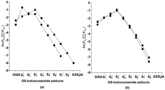 Logarithmic relative distribution of GSSnA adducts in (a) aerobic and (b) anaerobic reactions between GSNO and Na2S (1:1) with IA present at the beginning (filled circle) or added after 1 hr initiation (filled square) as calculated from the peak area of their respective SICs.