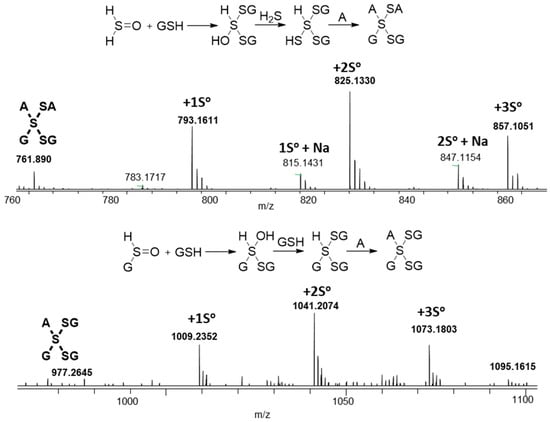 Mass spectra of sulfanedithiols derived from sulfinyls of (H2SO) and GS(O)H in the reaction of GSNO (1 mM) and Na2S (1 mM) in the presence of IA (5 mM) in iP buffer, pH 7.