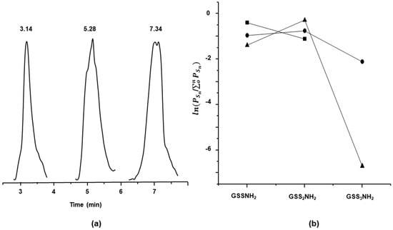 The presence of reduced polysulfide derivatives was then investigated. Only very small signals for reduced polysulfide anions, GSSn−, were observable in negative ion mode; much better signals were obtained for the protonated GSSnH in positive ion mode, but only a limited number were detected, (Supplementary Materials S10 and S11). A larger range of polysulfides was identified using the S-H selective trap IA, characterization as alkylated polysulfides GSSnA (where A = CH2CONH2, and n = 0 to 9), Equation (1). As shown in Figure 2b, the normalized individual SIC mass spectra show the expected increase of the (m + 2) isotopomer over the series, due to the increase in 34S which has a natural abundance of 4.29%.