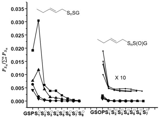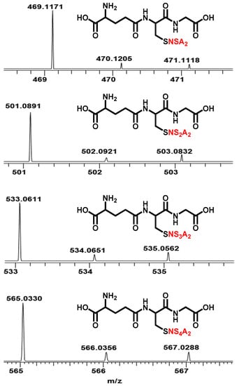 Several control experiments were carried out to assess the effect of pH, temperature, and sulfide/sulfane source on the product distributions (Supplementary Materials S3–S9). Similar distribution profiles were observed at pH 7 and 10 (Figure S3), at 25 °C and 35 °C (Figure S4), as well as ones using gaseous H2S instead of solid Na2S (Figure S5). GSSG reacts with H2S generating GSSnSG species with n = 1–4. As was previously reported, elemental sulfur, S0, is incorporated into both GSSG and GSH forming polysulfanes (Figure S6), but no reaction is seen with GSNO. The presence of S0 in situ during reactions of GSNO and Na2S had little overall effect on product distribution (Supplementary Materials S7). Thiosulfate reacts with GSH to form GSSnSG species with n = 2–5 (Supplementary Materials S8), and the addition of thiosulfate to reactions of GSNO and Na2S does affect the resulting GSSnSG distribution (Supplementary Materials S9).