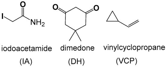 These various species were characterized by Orbitrap liquid chromatography-high resolution mass spectrometry (LC-HRMS), using selective traps shown in Scheme 2. The S-H selective trap iodoacetamide (ICH2CONH2 or IA) alkylates thiols generating stable thioethers which are readily characterized by HDMS. The S-OH selective trap dimedone (DH) which reacts with sulfenic acids in proteins []; it and its derivatives have been widely used to characterize S oxidation biological milieus [,,]. The radical trap vinylcyclopropane (VCP) is used to assess the possible involvement of S-based radicals in the formation of polysulfane chains. Although exact quantification of the whole menagerie of GSnX species is difficult, some mechanistic insight is provided by the distribution patterns of the various species under different conditions.