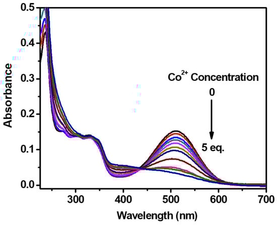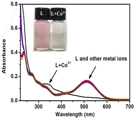 The colorimetric selectivity of the L sensor was examined first. The absorption response of L with various metal ions of Na+, K+, Ag+, Cu+, Mg2+, Zn2+, Ca2+, Sn2+, Cu2+, Ni2+, Mn2+, Pb2+, Cd2+, Ba2+, Hg2+, Fe2+, Co2+, Fe3+, Al3+ and Cr3+ was carried out in CH3CN/HEPES (4/1, v/v, pH = 7.4). As shown in Figure 1, L (1 × 10−5 M) itself in CH3CN/HEPES (4/1, v/v, pH = 7.4) showed a pink color and an obvious absorption peak emerged at 510 nm, which may be due to the existence of intramolecular charge transfer (ICT) transition between the nitrogen atom (often an amide group) and the quinone ring [], which thus caused absorption in the visible region. Upon the addition of five equivalents of Co2+, the band at 510 nm decreased sharply, almost disappeared and was accompanied by a weak absorbance under 0.05, which means nearly no absorption was observed in the visible region (420–700 nm). This was because of the coordination of the nitrogen atom and Co2+, which resulted in the extremely decreased electron-donating ability of the nitrogen atom involved in coordination; accordingly, this decreased ICT transition. Meanwhile, the absorption band at a short wavelength area (300–420 nm) was redshifted by about 20–50 nm relative to that of L and L with other cations. This was probably caused by the complexation of Co2+, with L giving an increased degree of conjugate for the L-Co2+ complex. The addition of Co2+ caused obvious absorbance changes, not only in the UV range but also in the visible range. Through reacting with Co2+, L exhibited a weak absorption with a color change from pink to colorless which could be easily read out with the naked eye. Other cations had negligible effects on the absorption peak.