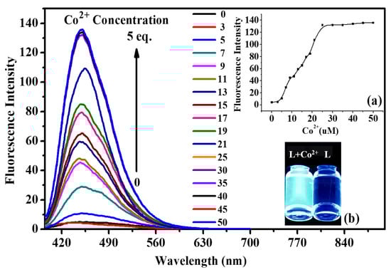 Changes in the fluorescence spectra of L (1 × 10−5 mol L−1, λex = 380 nm) after the addition of increasing amounts of Co2+ (zero-to-five equivalents) in CH3CN/HEPES (4/1, v/v, pH = 7.4) at room temperature. Inset: (a) The curve fitting of the fluorescence titration; (b) the color changes observed by UV light of L (1 × 10-5 mol L-1) and upon addition of five equivalents of Co2+ in CH3CN/HEPES (4/1, v/v, pH = 7.4).
