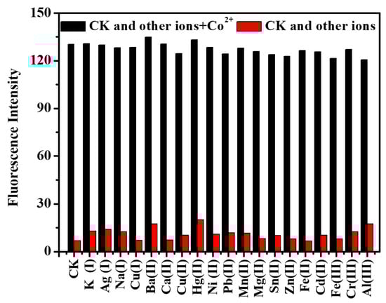 Selectivity, which represents the relative fluorescence response for the primary cation over other cations, is one of the most important characteristics of a selective chemosensor. To examine the selectivity for Co2+ in a complicated background of potential competing species, the fluorescence enhancement of L with Co2+ was investigated in the presence of other metal ions (Figure 5). An immediate increase in the emission intensity after the addition of Co2+ ions provided further evidence for the high selectivity of L. The non-fluorescence property of the product of the L probe (10 μM) and five equivalents of Co2+ was scarcely influenced by the presence of 15 equivalents of competing ions. The result revealed that L, as a potential Co2+ fluorescent sensor, could selectively bind with Co2+ in the presence of other metal ions.