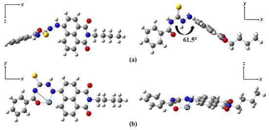 The energy-minimized structures of (a) L and (b) the L-Co2+ complex.