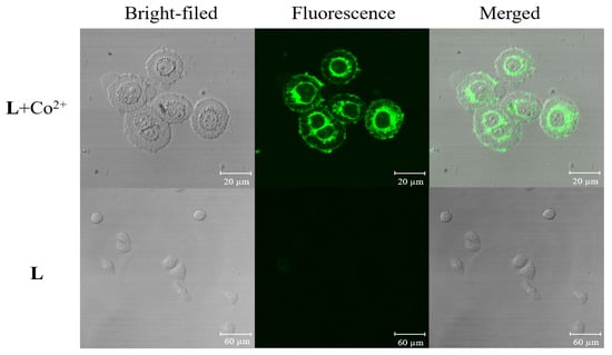 Finally, we further tested the capability of the L probe to detect Co2+ in HepG2 cells. The HepG2 cells were incubated with L (10 μM) for 30 min at 37 °C. Simultaneously, the cells were further raised with different concentrations of Co2+ for 30 min and then subjected to images. HepG2 cells treated with L were shown in Figure 11. After the addition of 25 μM Co2+, a remarkable fluorescence signal could be observed (Figure 11), which was consistent with the titration experiment. Meanwhile, fluorescence imaging figure corresponding bright-field image had a good coincidence degree. Merged images of fluorescence and bright-field images showed that the fluorescence signals were localized in the intracellular area, indicating a subcellular distribution of Co2+ and a good cell-membrane permeability of the L chemosensor. As shown in Figure 11, this proved that the cells were viable during the experiments. This result indicated that the L compound could be effectively used for cell imaging and detected the presence of Co2+ in vivo.