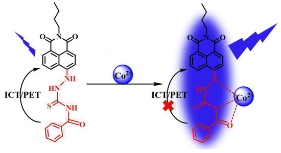 Based on this consideration, a new chemosensor N-(2-(2-butyl-1,3-dioxo-2,3-dihydro-1H-benzo[de]isoquinolin-6-yl)hydrazine-1-carbonothioyl)benzamide (L) was designed and synthesized for the highly selective detection of Co2+. The L chemosensor detected Co2+ by a color change from pink to colorless via the naked eye with high selectivity. In addition, L-Co2+ showed a remarkable enhancement of the fluorescence intensity in a CH3CN/HEPES (4/1, v/v, pH = 7.4) solution. Moreover, the L probe could detect Co2+ down to a concentration of 0.26 µM. The qualitative and quantitative analysis of Co2+ ions can be realized through color transformation and spectral changes, respectively. It was envisioned that the free L emitted weak fluorescence due to the photoinduced electron transfer (PET) and intramolecular charge transfer (ICT) processs from the imino N atom to the naphthalimide units. However, the coordination of Co2+ with ligating atoms modulated the electron/charge distribution not only blocked the PET effect, it also reduced the low-energy ICT emission. Last but not the least, the L probe was workable and effective for the fluorescence imaging of Co2+ in a biological environment.