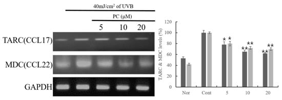 Effect of PC (1)-treated HaCaT cells on MDC and TARC expression. HaCaT cells were pre-treated with different concentrations of PC (1) (5, 10, 20 μM) for 1 h. The cells were further stimulated with 40 mJ/cm2 UVB. After 6 h, the cells were harvested, and relative mRNA levels were determined. Histograms show the densitometric data for TARC and MDC mRNA normalized to the level of GAPDH. Each value represents the mean ± SD of three individual experiments. Nor: Non-treated cell group (0 h), Cont: 40 mJ/cm2 UVB-treated cell group. Data are expressed as the means ± S.D., n = 3. * p < 0.001 and ** p < 0.0001 compared to the control group.