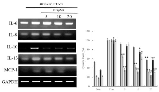 Subsequent experiments were conducted to evaluate cytokine and chemokine mRNA levels following treatment with PC (1), which showed the best inhibitory activities on inflammatory chemokine and cytokine among the compounds (1–6). PC (1) showed potent inhibitory activities on the expression of chemokines and cytokines, including TARC and MDC, and IL-6, 8, 10, 13, and MCP-1 (Figure 1 and Figure 2). In particular, PC (1) dose-dependently suppressed IL-6, IL-10, and IL-13 mRNA expression. Further, at a dose of 20 μM, PC (1) significantly inhibited IL-8, IL-10, and IL-13. At the mRNA level, PC (1) dose-dependently inhibited UVB-induced MCP-1 (Figure 2).