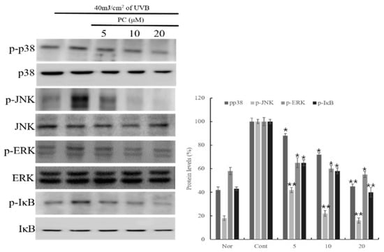 Effect of PC (1) treatment on MAPK expression in HaCaT cells. HaCaT cells were pre-treated different concentrations of PC (1) (5, 10, 20 μM) for 1 h. The cells were further stimulated with 40 mJ/cm2 UVB. After 6 h, the cells were harvested, and the relative protein levels were determined. Histograms show the densitometric data of p-p38, p-JNK, p-ERK, and p-IκB protein normalized to GAPDH. Each value represents the mean ± SD of three individual experiments. Nor: Non-treated cell group (0 h), Cont: 40 mJ/cm2 UVB-treated cell group. Data are expressed as the means ± S.D., n = 3. * p < 0.001 and ** p < 0.0001 compared to the control group.