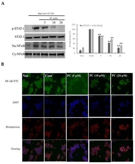 Further, we investigated the effect of PC (1) on UVB-irradiated NF-κB translocation and STAT1 phosphorylation. PC (1) dose-dependently inhibited the translocation of NF-κB from the cytoplasm to the nucleus (Figure 5A). PC (1) showed stronger inhibitory activities than the group treated with UVB irradiation alone, a potent pharmacological inhibitor of NF-κB translocation into the nucleus. This approach has been suggested as an indirect method for controlling inflammation-related disease. Finally, PC (1) dose-dependently decreased the expression of p-STAT1 (Figure 5B).
