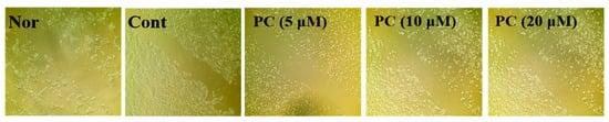 Increased cell proliferation and migration activities of PC (1)-treated HaCaT cells. HaCaT cells were scratched with a yellow tip. Migration levels of HaCaT cells were observed using an optical microscope and photographs were obtained. HaCaT cells were treated with different concentrations of PC (1) (5, 10, 20 μM) for 24 h. PC (1) treatment led to an increase in the migration of HaCaT cells. Nor: Non-treated cell group (0 h), Cont: 40 mJ/cm2 UVB-treated cell group.