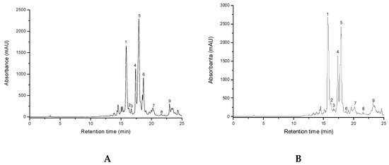 HPLC chromatograms for T. marschallianus from culture (TMc) (A) and T. marschallianus (TMs) (B). Notes: Chromatographic conditions were as given in the Experimental section. The identified compounds: 1. luteolin-7-O-glucuronide, 2. quercetin-3-O-glucoside, 3. quercetin-7-O-arabinoside, 4. apigenin-7-O-glucuronide, 5. methyl-rosmarinate, 6. rosmarinic acid, 7. quercetin, 8. luteolin, 9. apigenin.