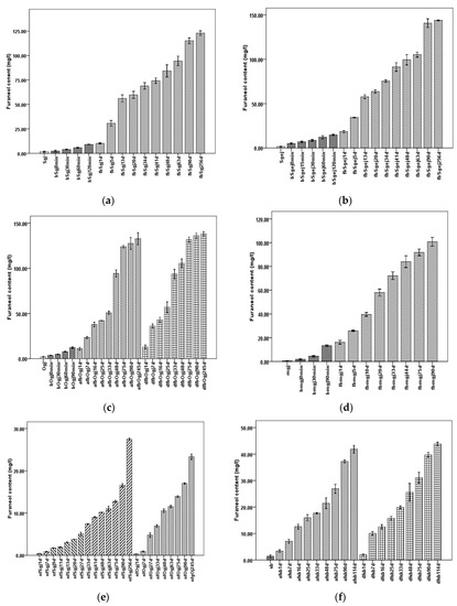 During fermentation (day 0 to approximately day 45), the furaneol content increased more than 6.3–9.3 times compared with the content after grape juice concentration (bSgj120min, bOgj120min, bSgej120min, and bmgj90min), to over 84 mg/L in the approximately 45 days fermentations (fbSgj48d, dfbOgj48d, afbOgj48d, fbSgej48d, and fbmgj44d) (Figure 1a–d, Table S1). In the sb model, the furaneol content increased up to 21.42 ± 0.51 mg/L in afsb48d and 25.54 ± 0.84 mg/L in dfsb48d (Figure 1e, Table S1). That was 15.3 and 18.24 times higher, respectively, than furaneol content in sb (1.401 ± 0.129 mg/L). For the natural fermentation of grape juice, the furaneol content increased 6.02 times in nfSgj48d and 5.53 times in nfOgj48d compared with the furaneol content in Sgj and Ogj grape juice, accordingly (Figure 1f, Table S1). The final Msalais wine, after 90–256 days of storage, contained over 100 mg/L furaneol and was significantly different between fbSgj256d, fbSgej256d, afbOgj245d, dfbOgj245d, and fbmgj90d (p < 0.05) (Figure 1a–d, Table S1). Further, the furaneol content increased in the nf group, up to 23.32 ± 0.165 mg/L in nfgOj245d and 27.47 ± 0.07 mg/L in nfSgj256d (Figure 1f, Table S1). During storage in the sb model, the furaneol content increased up to 43.83 ± 0.17 mg/L in afsb114d and 41.84 ± 0.37 in dfsb114d, which was significantly higher than that in the nf group (p < 0.05) (Figure 1e,f, Table S1). Furthermore, furaneol content in samples fermented and stored for the same or similar periods of time, e.g., 90 days, was also significantly different (p < 0.05) and ranked, in decreasing order, as follows: fbSgej > fbOj > fbSgj > fbmj > fsb > nf (Table S1).