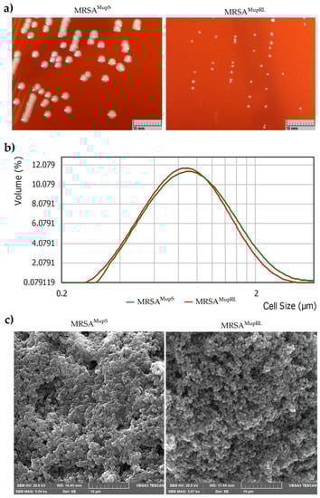 Comparison of the sizes of growing MRSAMupS and MRSAMupRL colonies on Columbia agar with 5% sheep blood (a), and cells using Mastersizer 2000 (b), and SEM (c).