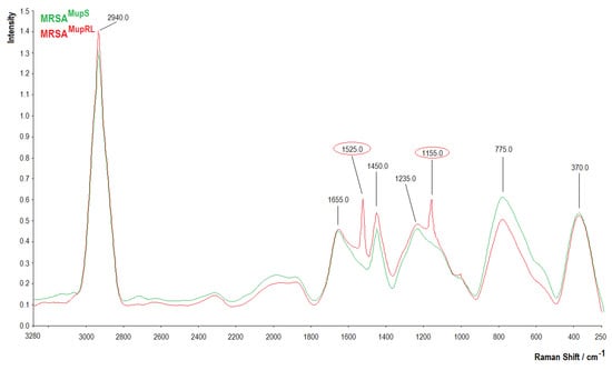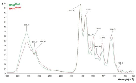 In order to confirm the presence of particular chemical moieties in MRSAMupS as well as MRSAMupRL cells, FTIR and Raman spectroscopy analyses were carried out. After the cultivation of these strains for 18 h at 37 °C on Columbia agar with 5% sheep blood, the cells were washed three times by 5 mL of PBS, centrifuged at 5000 for 5 min, and dried for 24 h at 37 °C. The FTIR spectra of bacterial cells dry samples were obtained at room temperature by attenuated total reflection with a FTIR spectrometer (Perkin Elmer Spectrophotometer 100, Waltham, MA, USA). The samples (100 mg) were then scanned at a range between 650 cm−1 and 4000 cm−1 (64 scans and 1 cm−1 resolution). The obtained spectra were normalized, baseline corrected, and analyzed using SPECTRUM software (v10, Perkin Elmer Spectrophotometer, Waltham, MA, USA).