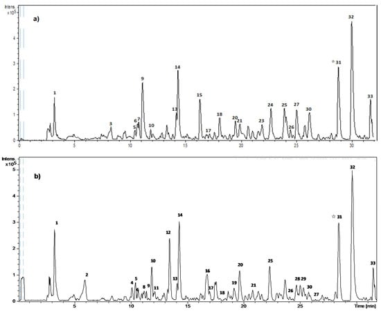 HPLC-DAD-ESI-TOF/MS chromatograms of olive pomace extracts. (a) Olive pomace extracts obtained by conventional extraction (OP), and (b) olive pomace extracts obtained by pressurized liquid extraction in optimal conditions (OP-PLE). ☆ Internal standard (Naringenin).