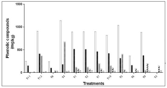 Table 2 shows the quantitation of individual phenolic compounds for each treatment of PLE system. The total phenolic content (PC) of OP-PLE extracts ranged from 241.1 to 1141.3 mg/kg d.w OP. Figure 2 includes the total phenolic compounds and the total content in secoiridoids, phenolic alcohols, flavonoids, and lignans. Secoiridoids reached the major concentration, ranging from 103.4 to 517 mg/kg d.w OP (42.9–57.6%, respectively). The highest amounts of secoiridoids were obtained for secoiridoid derivative (m/z 407), hydroxy oleuropein (m/z 555), and oleuropein (m/z 539). With regard to phenolic alcohols, hydroxytyrosol (m/z 153) and oxidized hydroxytyrosol (m/z 151) were identified and quantified. Their concentrations ranged from 0 to 675.6 mg/kg d.w OP. The highest phenolic alcohol contents were obtained in conditions T4, T5, and T12, where the higher temperature and water content, the higher the phenolic alcohol content. This result could be explained because the high extraction temperature and water content in solvent extraction could generate the hydrolysis of secoiridoids into phenolic alcohols and acidic moieties. These results agree with those reported by [29].