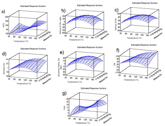 Response Surface graphs for (a) hydroxytyrosol, (b) hydroxy D-oleuropein aglycone, (c) hydroxy-oleuropein, (d) demethyl oleuropein, (e) decarboxymethyl oleuropein aglycone, (f) oleuropein content, and (g) yield.