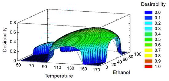 Response surface methodology (RSM) was applied to determine the optimal conditions for the OP-PLE system by multiple response optimization using the desirability function (DF) where the response variables were maximized. The data were fitted to a second-order regression model according to Equation (8).