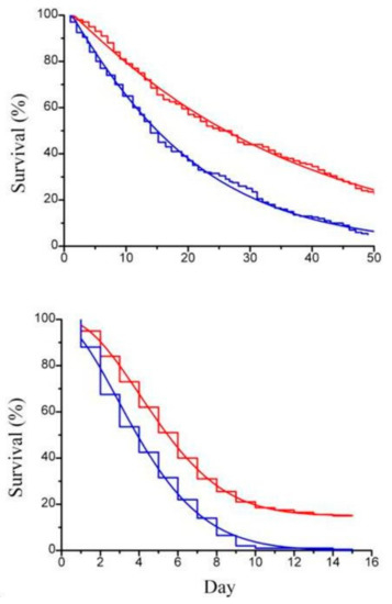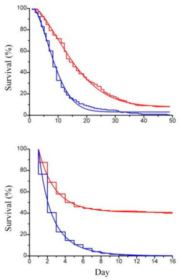 (a) Survival curve (step line) of Artemia sp.; (b) survival curve (step line) of Artemia sp. offspring with the corresponding Weibull survival functions (continuous line), with paramylon (red curve) and without paramylon (blue curve), under conditions of daily medium replacement.