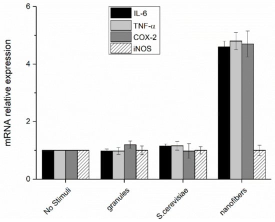 The increase in the transcription factor translocation led to a consequent increase of the expression of pro-inflammatory mediators (TNF-α, IL-6, COX-2, and iNOS) in cells treated with paramylon nanofibers, whereas the level of expression in the cells treated with paramylon granules and S. cerevisiae preparation did not significantly differ from that of non-treated control cells. These mediators are high inflammatory and are indispensable when priming immune responses and licensing dendritic cells (Figure 9).