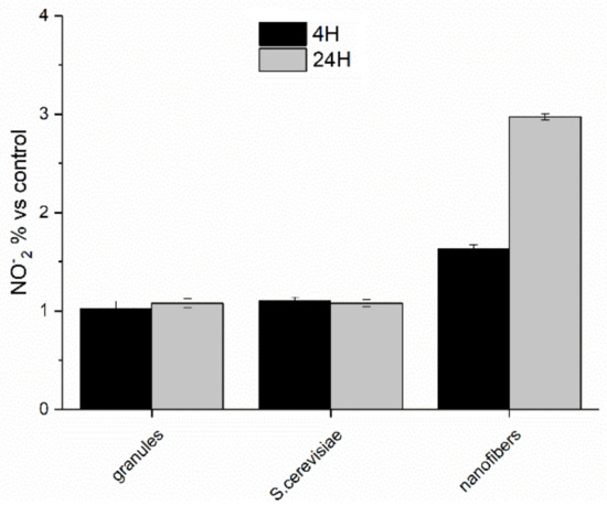 Nitric oxide production by PBMC cells stimulated with paramylon granules, S. cerevisiae preparation, and paramylon nanofibers 4 and 24 h, expressed as percent nitrite concentration versus control and plotted as the mean ± SD.