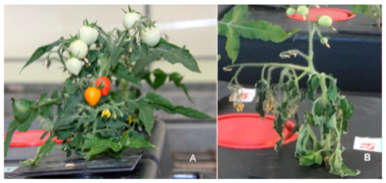 The representative features of the tomato plants (aerial parts) cultivated under water-stressed conditions coupled with root treatment with paramylon nanofibers (A) and under water-stressed conditions without paramylon nanofibers (B) 60 days after germination.