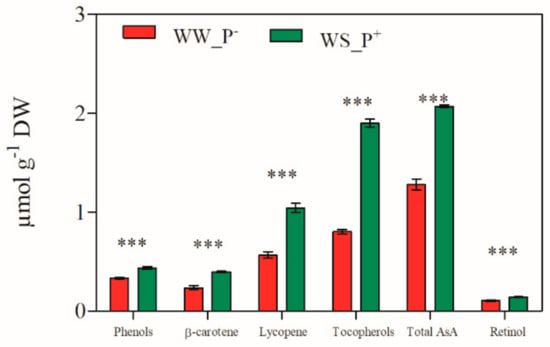 Antioxidant compounds in red ripe fruits of S. lycopersicum cv. Micro-Tom grown under well-watered conditions (WW_P−) and water-stressed conditions coupled with root treatment with paramylon nanofibers (WS_P+). Data are shown as mean ± SD. The significant differences are for: *** P < 0.001.