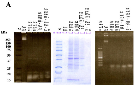 In SDS-PAGE and ethidium bromide staining, various short DNA fragments between the 17 kDa and 22 kDa protein markers were observed in all subpurified DNA samples (Figure 1A left). In contrast, the whole-size DNA was observed as a pure DNA. In electrophoresis using an agarose gel and ethidium bromide staining, large and small DNA fragments were observed in whole-size pure DNA and the four subpurified DNA samples, respectively (Figure 1A right). Therefore, sub-purified DNA after beads destruction for total 90 and 180 s indicated short-size fragments with different-size proteins, and subpurified DNA for 180 s treated with phenol and chloroform and proteinase K indicated short-size pure DNA without proteins.