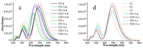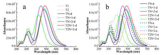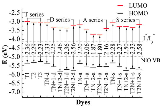 According to the transition configurations displayed in Table 2, the largest portion of transition configuration is HOMO to LUMO, and the HOMO−1 and LUMO+1 also take part in the transition. A larger portion of HOMO to LUMO taking part in the transition is beneficial for the hole injection from the dye to the valance band of NiO [30]. The contributions of HOMO to LUMO transition for T2N+1-d and T2N+1-s are 74% and 77%, which are the largest in D and S series, respectively, and are improved in comparison with T series dyes. The contributions of HOMO to LUMO transition for T2N+2-d and T2N+2-s are 28% and 43%, which are the lowest in D and S series, respectively, and lower than those of the T series. For other dyes of the D and S series, the contributions of HOMO to LUMO transition are similar to those of the T series. However, the contributions of HOMO to LUMO transition for the A series are all smaller than those of the T series.