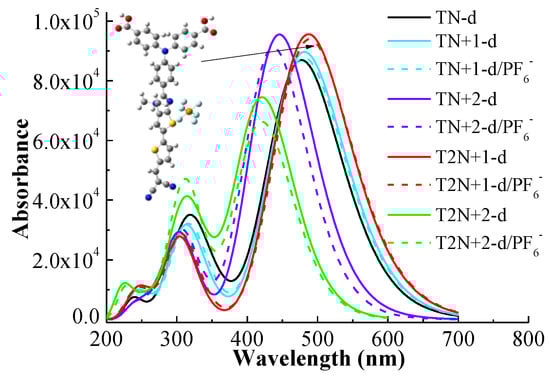 The dyes with N+ moiety act as p-type photosensitizers have been synthesized and reported in the literatures [3,16,31]. Indeed, there could be an interaction between N+ moiety of the dyes and the counterions. In the study of Marri et. al, a series of amine salt containing methylpyridine cation and PF6− anion is synthesized to be used as p-type photosensitizers [31]. Here PF6− anion was chosen as the counterion of N+ moiety (RN+) to investigate its effect on the photophysical properties of dyes. The RN+/PF6− geometrical structures of D series dyes and their UV-vis absorption spectra were calculated at the same level as N+ cation. Figure 5 shows the comparison of the simulated UV-vis absorption spectra between RN+/PF6− and RN+. Compared with the UV-vis absorption spectra of RN+, the wavelengths of the absorption peaks for RN+/PF6− hardly change, and the intensities of the maximum absorption peaks change little. Importantly, the conclusions obtained from D series dyes are consistent with that of RN+/PF6−. For the four dyes containing N+ in D series, the absorption spectra of TN+1-d and T2N+1-d are hardly affected by PF6− anion, but the intensities of the maximum absorption peaks of TN+2-d and T2N+2-d are weakened a little by PF6− anion. This is related to two methyl groups connected to the N+ for TN+1-d and T2N+1-d, which can better protect N+ in the conjugation ring from the electronegative groups. For TN+2-d and T2N+2-d, there is only one methyl connected to the N+, which is coplanar with the conjugation ring where N+ locates in. This may lead to the electronegative groups approaching N+ less difficultly and the interaction between the N+ moiety and the electronegative groups enhanced. Hence, the intramolecular charge transfer toward acceptor for TN+2-d and T2N+2-d can be hindered somewhat by the electronegative groups, and the intensities of the maximum absorption peaks are weakened.