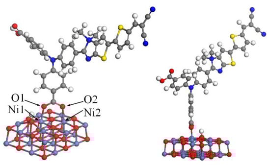 An example of the optimized dye/NiO structures with the lowest energy is presented in Figure 7, in which the dye binds onto the surface through the carboxyl group. As can be seen in Figure 5, the dye binds almost perpendicular to the NiO surface via bidentate coordination bridging that is stable [32,33]. The adsorption energies and the calculated bond lengths of Ni1–O1 and Ni2–O2 are also listed in Table 3. The Ni–O bond lengths of all dyes are in the range of 1.99 to 2.07 Å. These values are in good agreement with that from the literature [34].
