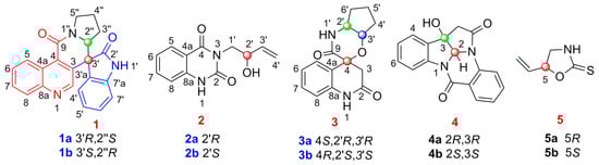 “Ban lan gen”, widely distributed and cultivated in the North of China, is the roots of Isatis indigotica Fort. (Cruciferae) [1,2,3]. As one of the most famous traditional Chinese medicines (TCMs), ban lan gen is usually used for the treatment of various kinds of diseases, such as influenza, fever, epidemic hepatitis and infections [4,5,6]. Previous phytochemical investigations of I. indigotica have led to the isolation of various kinds of natural constituents, including alkaloids, lignans, flavonoids and nucleotides [1,2,3,4,5,6,7,8,9], among which alkaloids have been considered as the most active constituents that possess anti-inflammatory, antiviral, antibacterial, antitumor and antioxidant activities [1,4,5,6,7,8,9]. For our continuous project to explore more bioactive components from I. indigotica [8,9], five pairs of alkaloid enantiomers were isolated from the 80% alcohol exact of I. indigotica roots. Among them, 1a/1b, 2a/2b and 3a/3b were determined as three pairs of new enantiomers, whose structures and absolute configurations were determined by extensive spectroscopic data analysis, including 1D, 2D-NMR and HRESIMS data, optical rotation data, comparison of their experimental circular dichroism (CD) and calculated electronic circular dichroism (ECD) spectra and single-crystal X-ray crystallography using anomalous scattering of Cu Kα radiation. The known forms (4a/4b–5a/5b, Figure 1) were identified by comparison of their spectroscopic and optical rotation data with those reported in the literature as (−)-(2R,3R)-3-hydroxy-2H-pyrrolo[2-b]indolo[5,5a,6-b,a]quinazoline- 9(8H),7′-dione (4a) [1], (+)-(2S,3S)-3-hydroxy-2H-pyrrolo[2-b]indolo[5,5a,6-b,a]quinazoline-9(8H),7′-dione (4b) [1], epigoitrin (5a) [10] and goitrin (5b) [10]. Alkaloids are one of the main types of active constituents in I. indigotica, and they have been reported to possess potential anti-inflammatory effects [1,2,3,4,5,6,7,8,9,10]. This pharmacological action, together with the traditional use for the treatment of epidemic hepatitis, prompted us to test the inhibitory effects on nitric oxide (NO) production of all the isolated alkaloids (1a/1b–5a/5b). Herein, the isolation and structure elucidation, putative biosynthetic pathways and the NO inhibitory activities of these enantiomers are presented.